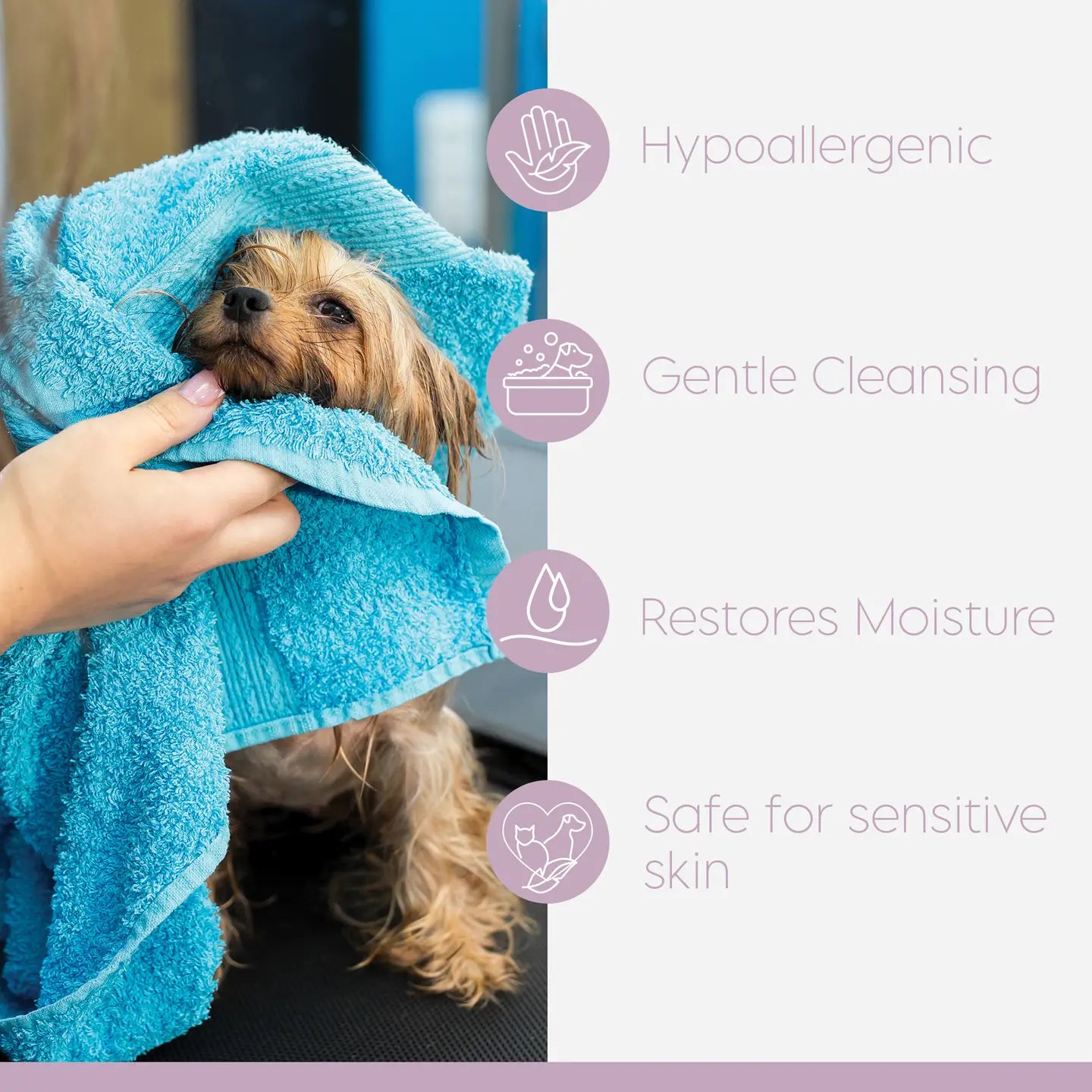 Provides relief from itchy, scaling, and sensitive skin. It also contains emollients to restore natural moisture to the skin and is a hypoallergenic formulation. Consumer Note: Aloe & Oatmeal Shampoo is a soap-free formulation. It can be used as often as necessary and will not strip the coat. Safe for use with topical flea control products.