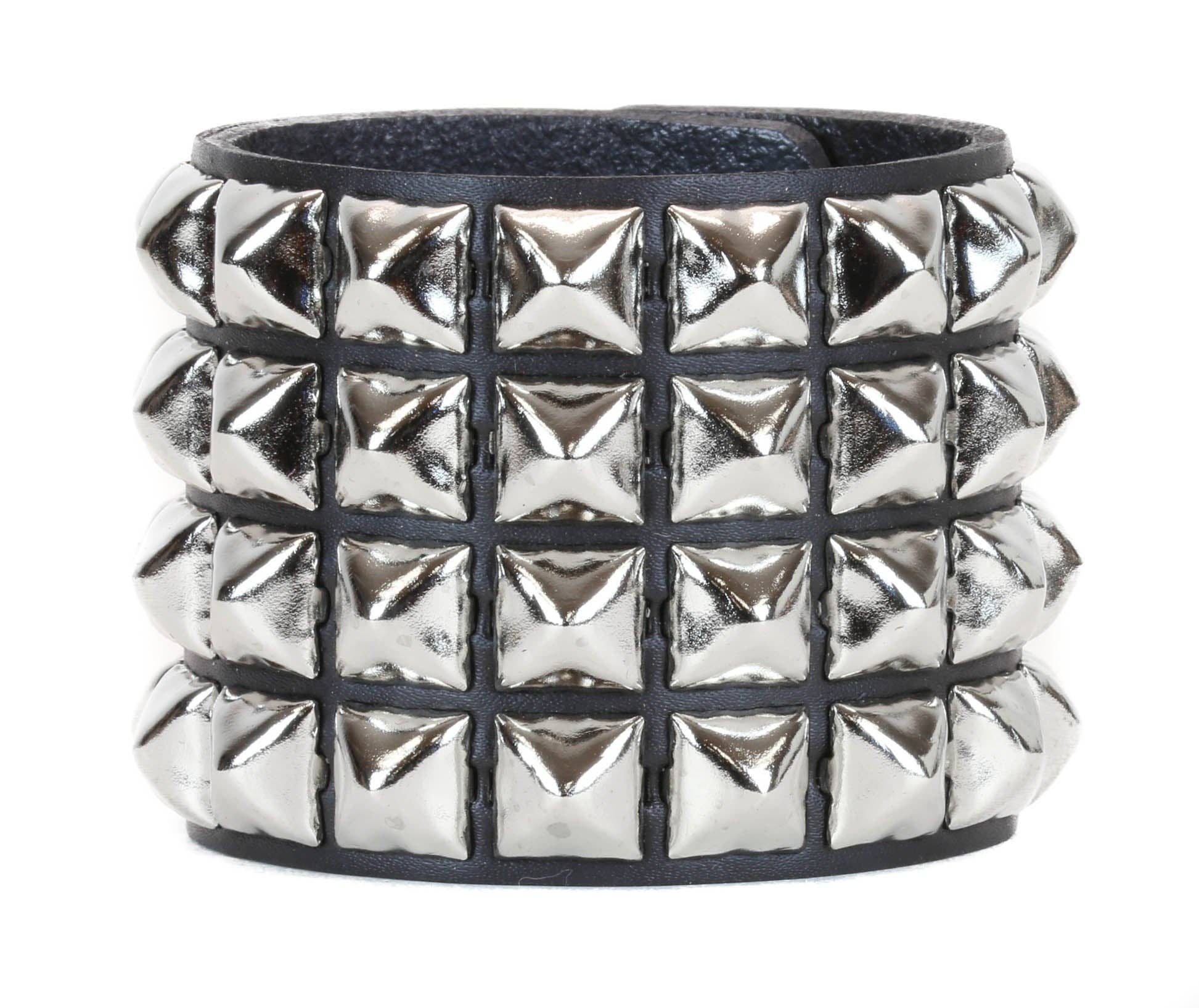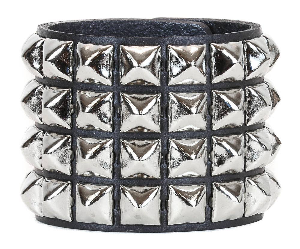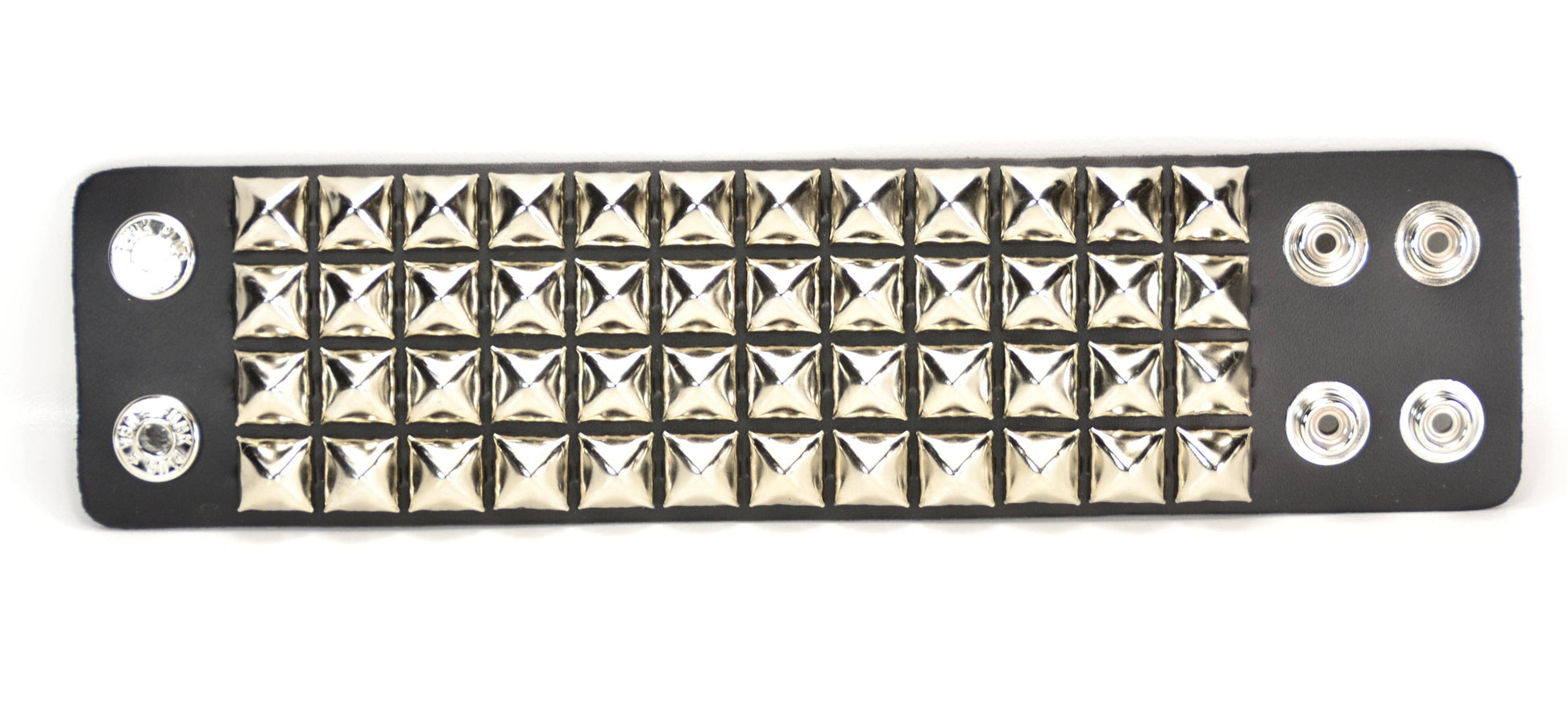 SNAP BRACELET WITH 4 ROW 1/2" PYRAMIDS - Manufacturing unit located in East Rutherford, New Jersey - Alternative accessory design brand focused on durability and longevity - Handmade from scratch, ensuring unique, carefully crafted pieces - Locally sourced materials, including premium leather from nearby tanneries - High-quality hardware incorporated in every product for enhanced durability