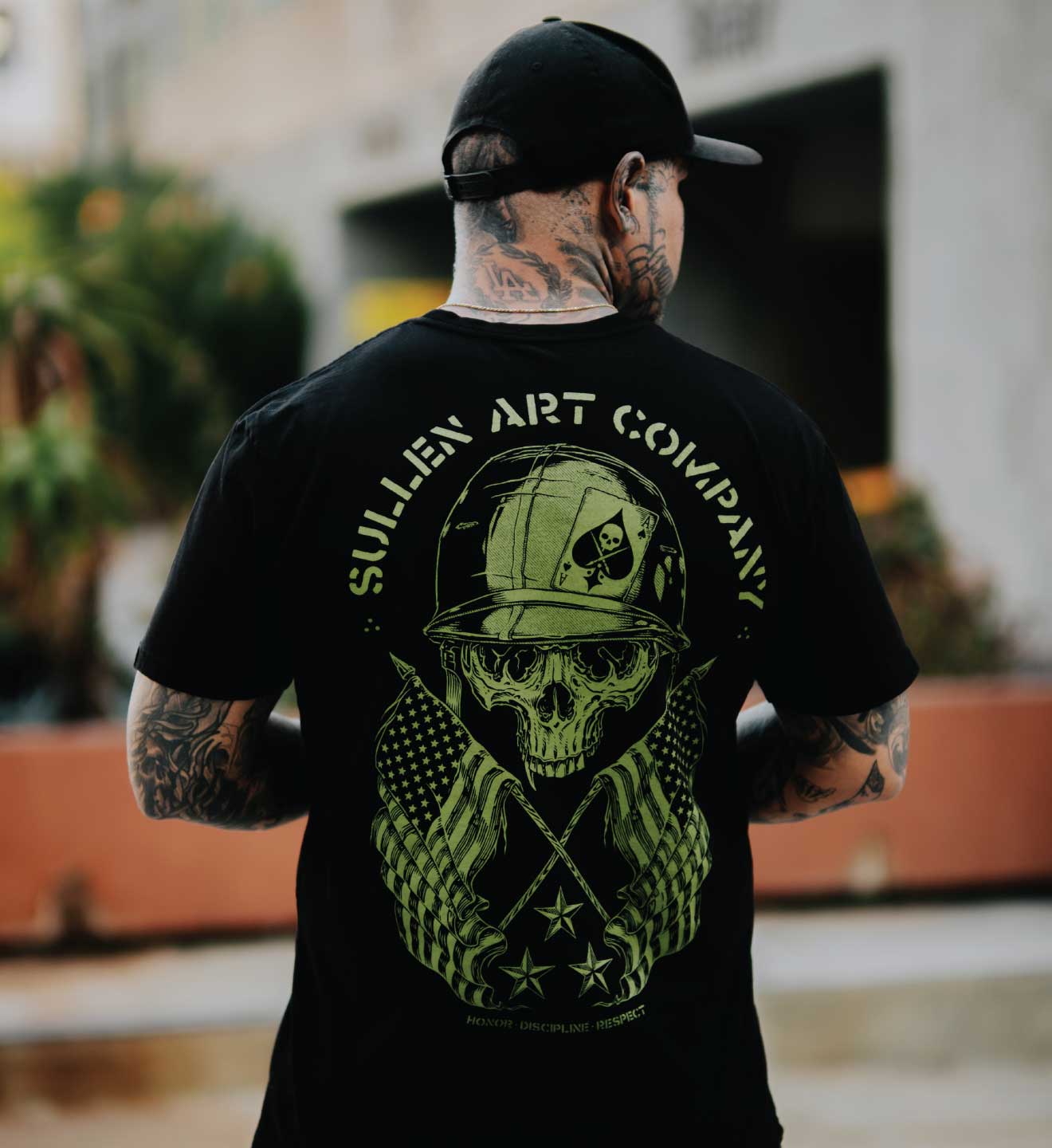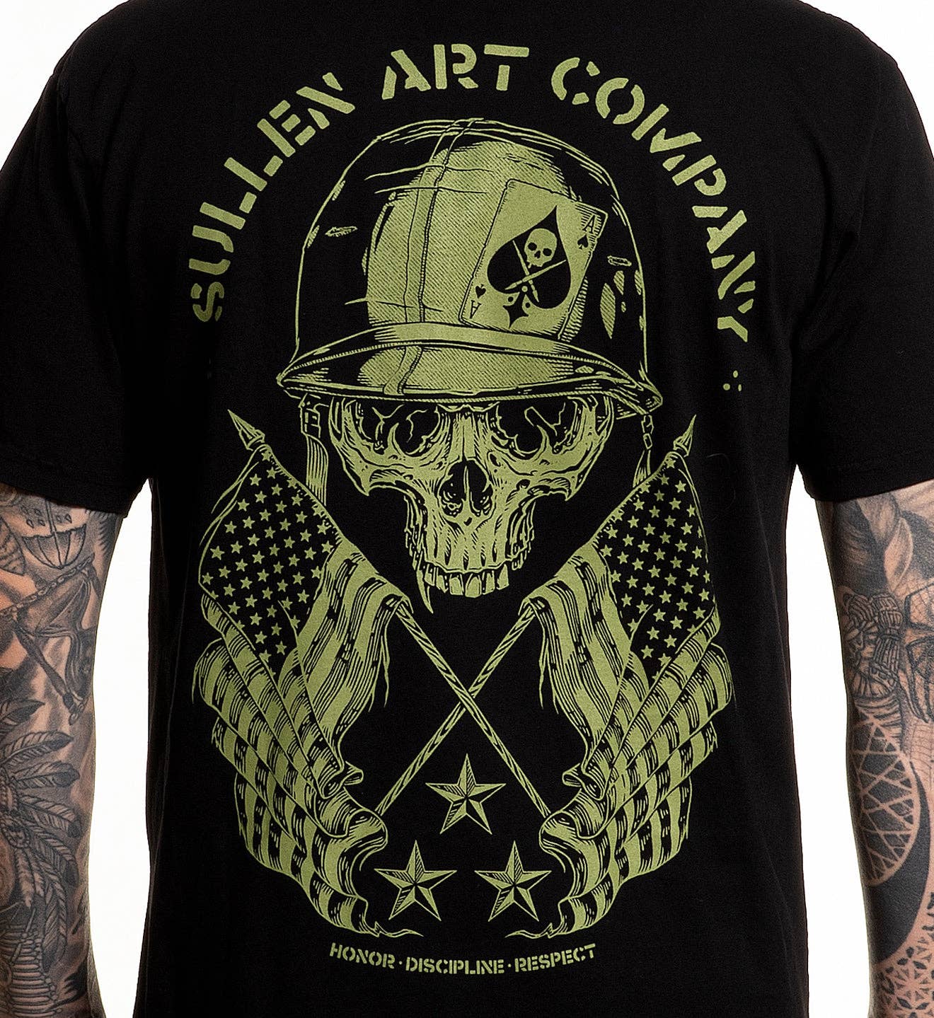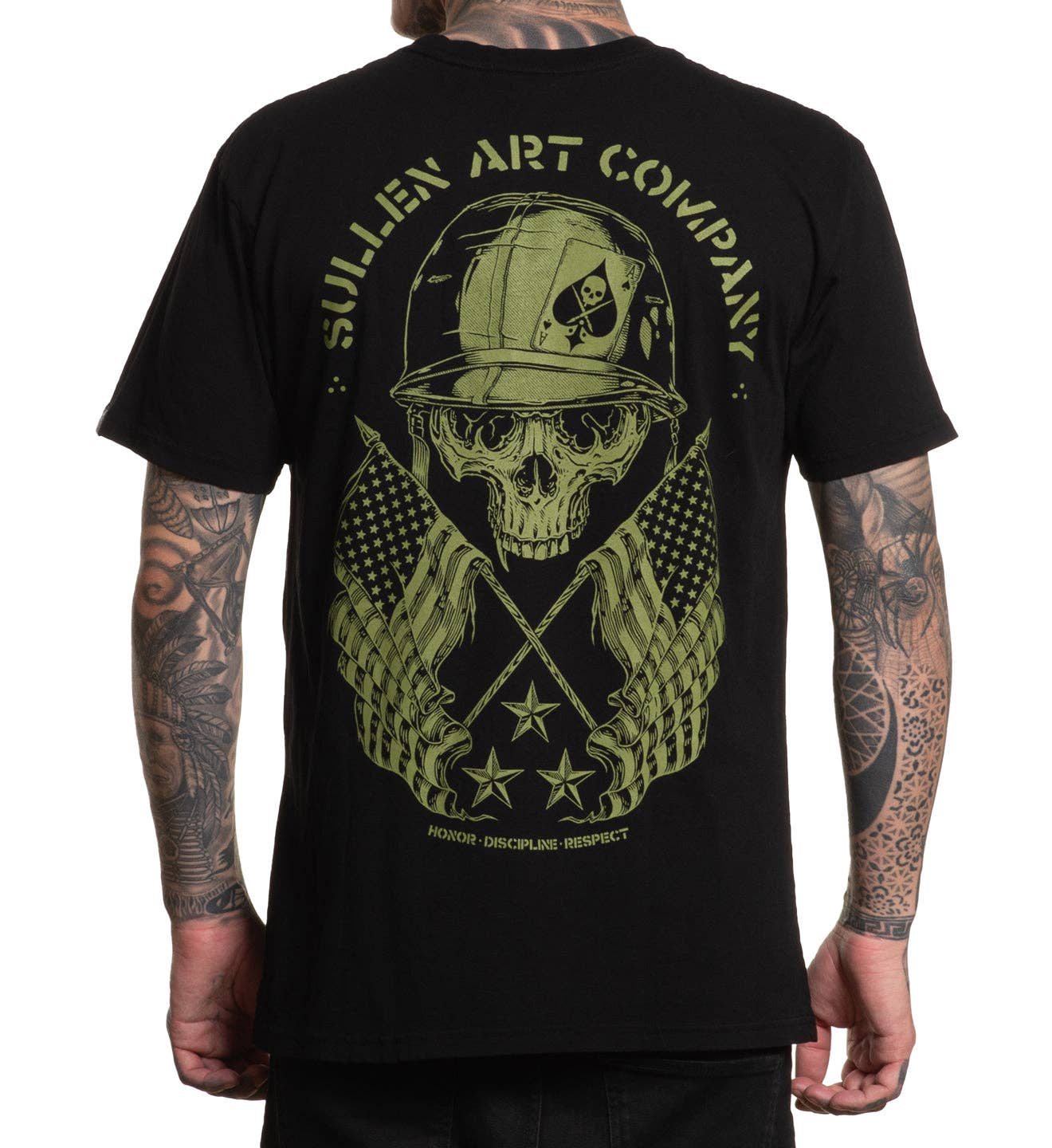 The GI Badge reworks our classic Sullen badge into a solid tribute to Memorial Day—complete with crossed flags, stars, and a skull in combat gear. Printed on our premium jet black tee for a tailored fit and all-day comfort. * Premium Fit * Model 5'9 Size XL - 200 lbs * 100% soft cotton jersey * Custom Dye Tee * Tagless for comfort * Machine washable * Set-in rib collar with shoulder-to-shoulder taping * Double-needle sleeve and bottom hem * Preshrunk to minimize shrinkage * Woven Sullen Badge label on left sleeve * Weight: 185g/m2