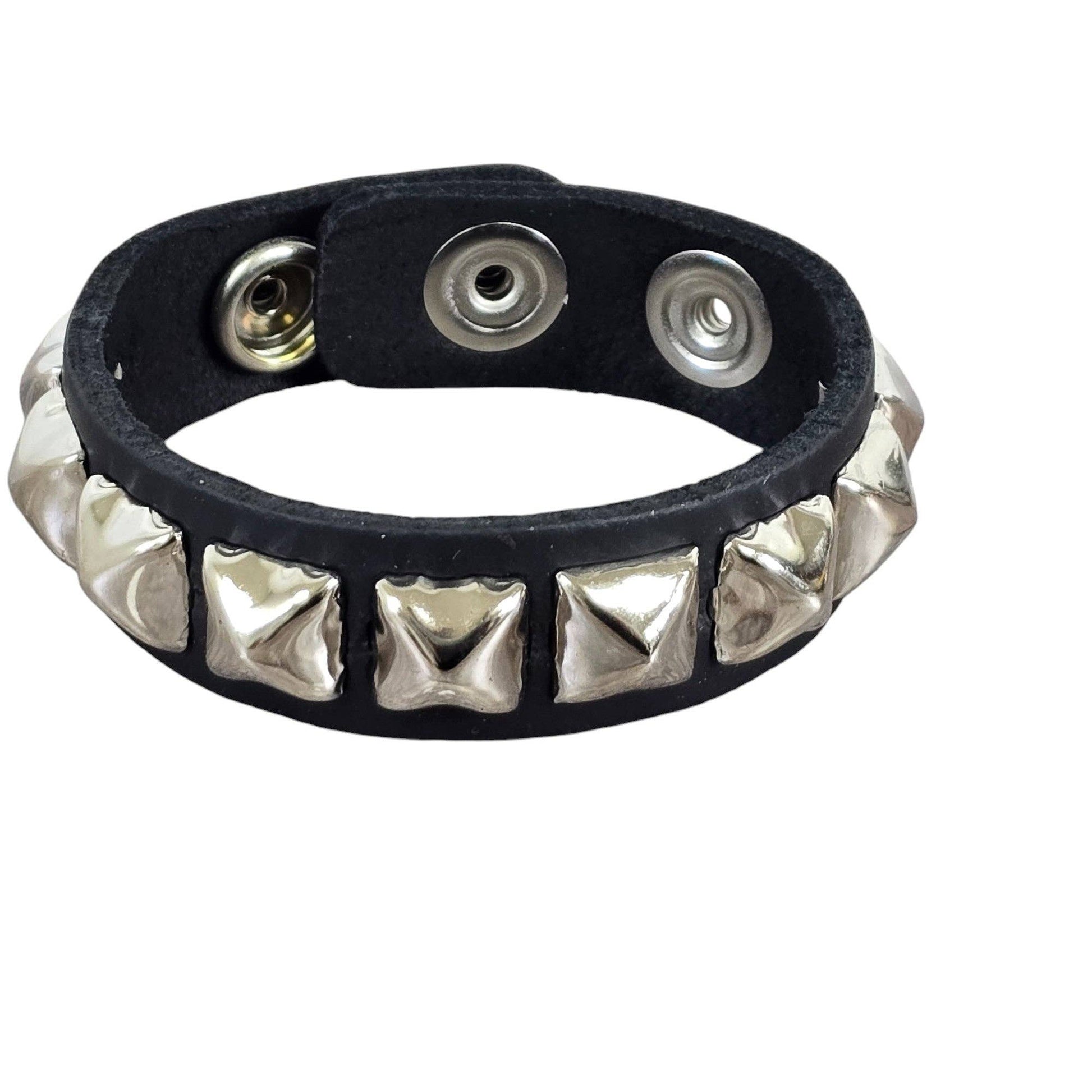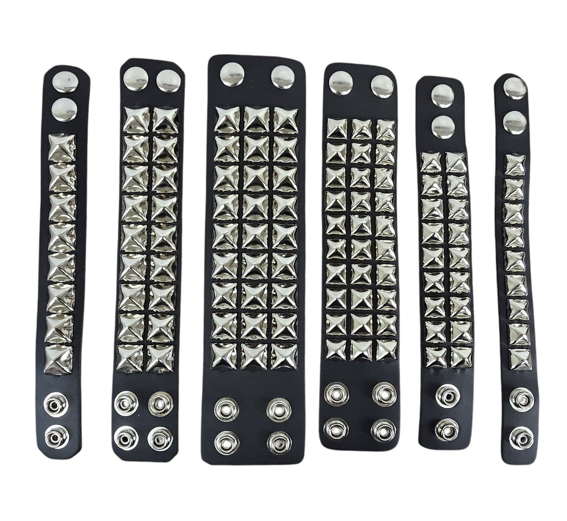 This genuine leather snap cuff bracelet features pyramid studs for a bold and edgy look. The snap closure makes it easy to wear and adjust, while the studded design adds a touch of attitude to any outfit. Upgrade your wrist game with this stylish accessory. 1 ROW 5/8"[ LARGER THAN REGULAR PYRAMID] PYRAMID-1" WIDE 2 ROW 5/8"[ LARGER THAN REGULAR PYRAMID] PYRAMID-1 1/2" WIDE 3 ROW 5/8"[ LARGER THAN REGULAR PYRAMID] PYRAMID-2 1/2" WIDE 1 ROW 1/2" [ REGULAR PYRAMID] PYRAMID-3/4" WIDE 2 ROW 1/2" [ REGULAR PYRAMID] PYRAMID-1 1/4" WIDE 3 ROW 1/2" [ REGULAR PYRAMID] PYRAMID-1 3/4" WIDE